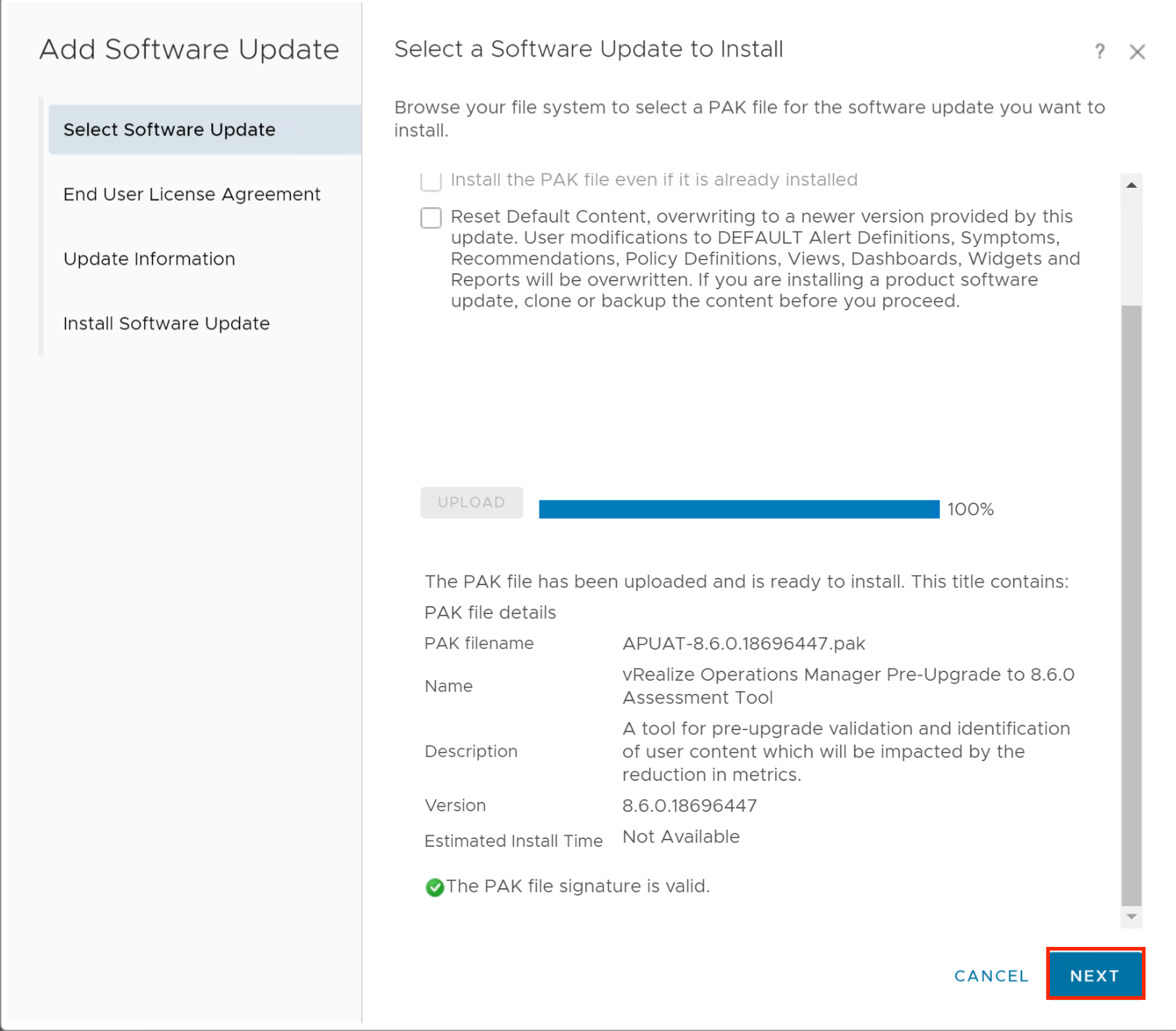 - Once uploaded and staged verify you have uploaded the pre-assessment check pak and click on Next to continue.