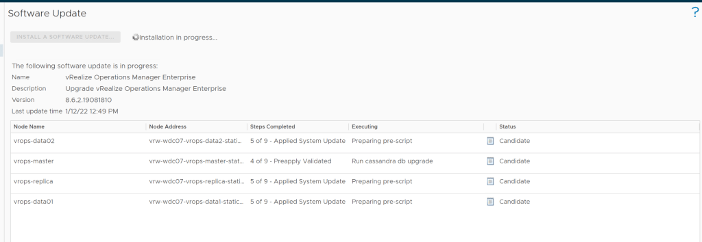 Depending on the version you are upgrading from this process can take some time – 25-30 minutes is not unusual. Continue to monitor the status as it progresses.