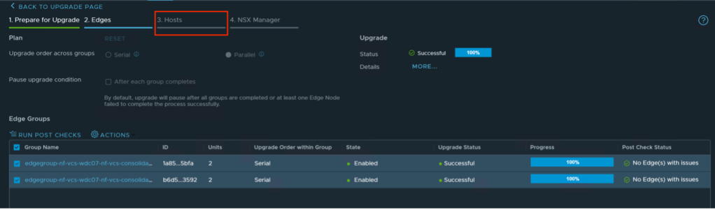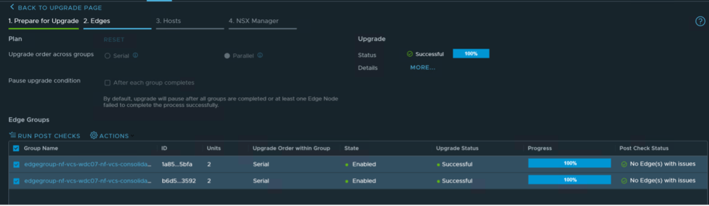 - Once complete if no errors are found the post check status will show No Edge(s) with issues. We are ready to move to the next step.