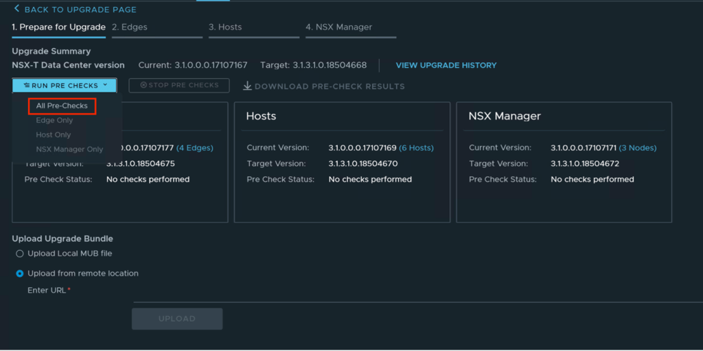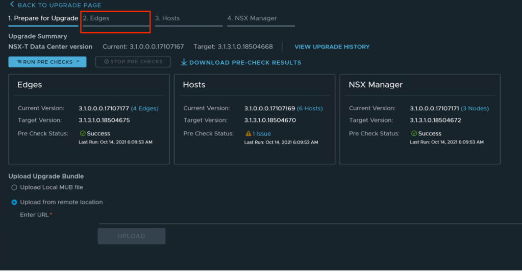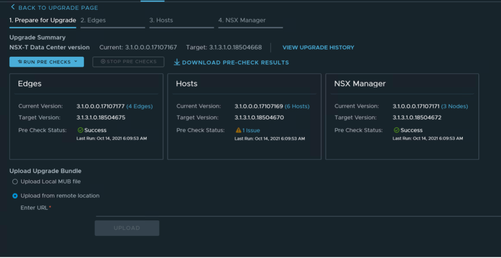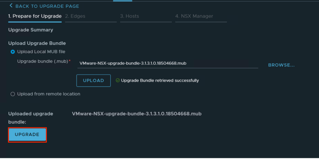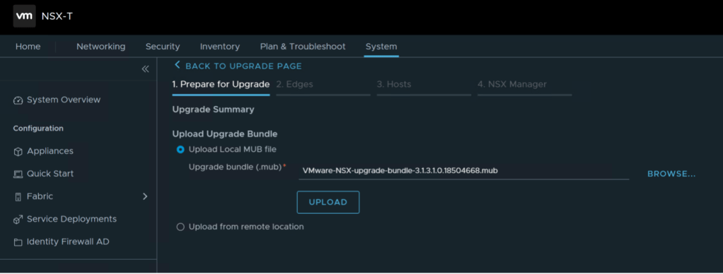 - The upgrade wizard will appear. Change the source from remote location to upload Local MUB file and click Browse to select the file you downloaded in step one. Then click Upload. It will take several minutes for the file to upload to the NSX Manager and be extracted and verified.