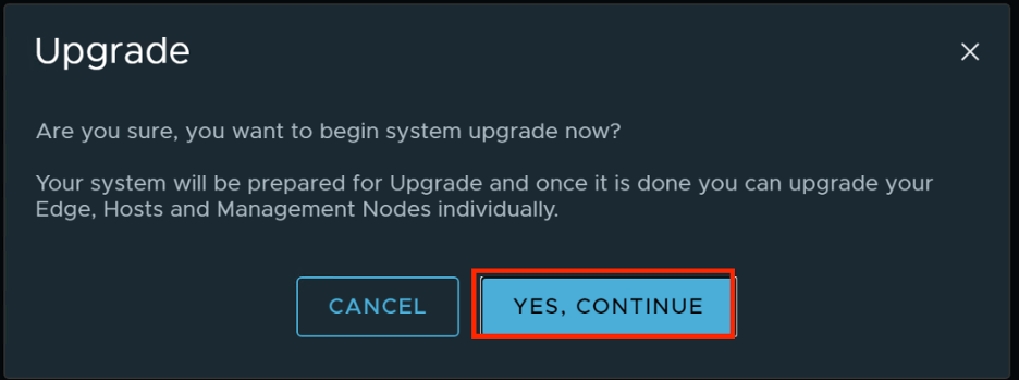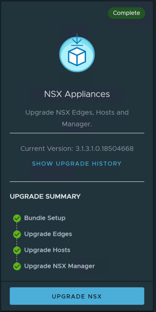 - During this next phase of the upgrade, you will be logged out of NSX Manager. When the login page appears, you may log back in to continue to monitor progress of the upgrade. Note that this upgrade process can take 30 minutes or more to complete.