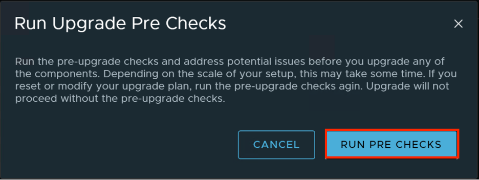 - A new window will appear confirming your selection. Click Run Pre Checks to continue.