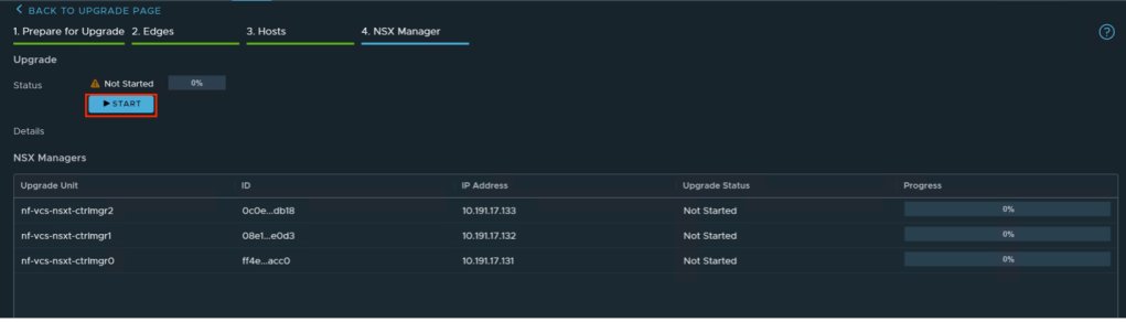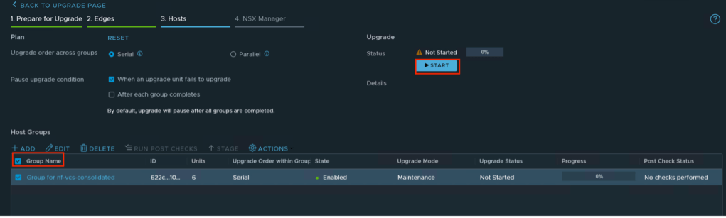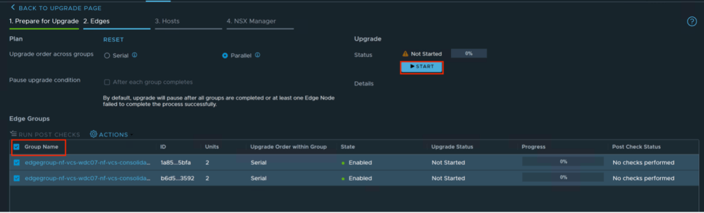 - The next step is to upgrade the edge nodes. Click on the checkbox next to Group Name to select all the edges, then click on Start. The status will change to in progress and the upgrade will begin. This upgrade will take several minutes to complete and the page will refresh throughout the upgrade. Several notifications will appear during the upgrade, these can be safely ignored.