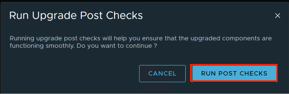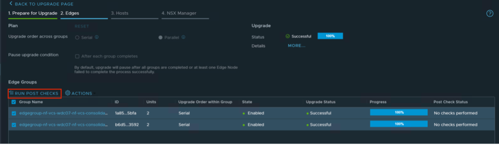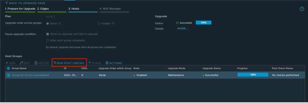 - Once complete the upgrade status will change to successful. Click on run post checks to ensure there are no issues.