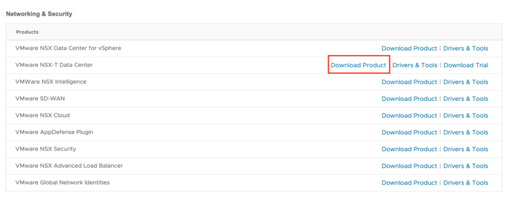 - Scroll down until you see VMware NSX-T Data Center and click on Download Product.