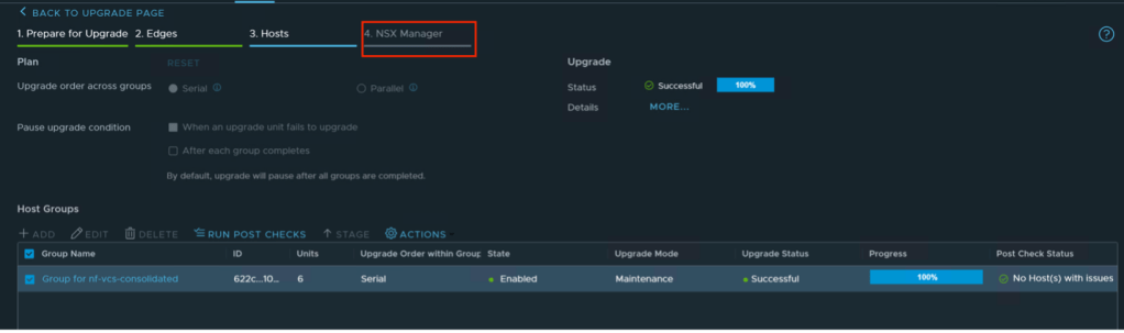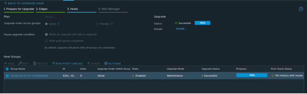 - Once complete if no errors are found the post check status will show No Host(s) with issues. We are ready to move to the next step.