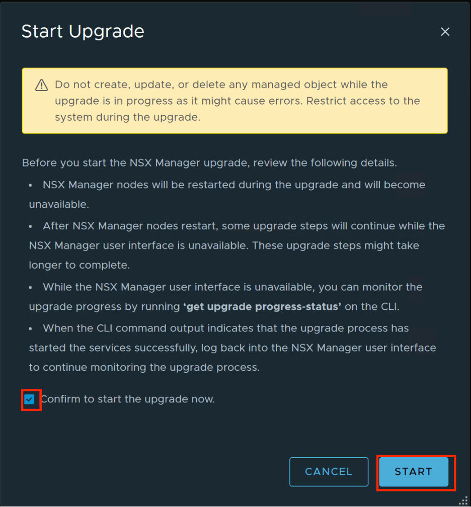 - Read the warning presented and click the checkbox next to confirm then start to begin the upgrade process. As stated, you may wish to log into the CLI to monitor status.