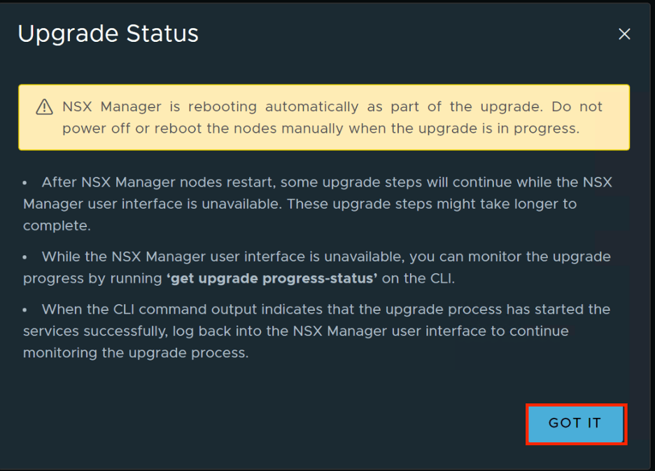- Approximately 80% through the upgrade a new window will appear notifying you that the NSX Manager is rebooting, click got it to continue.