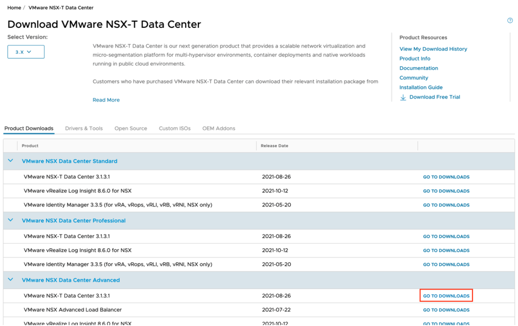 - Click on Go To Downloads for the version of NSX-T that has been deployed in your instance. If you are not sure which version is installed, you may find this information on the Summary page of your instance in the IBM Cloud portal. In the example VMware NSX Data Center Advanced is used.