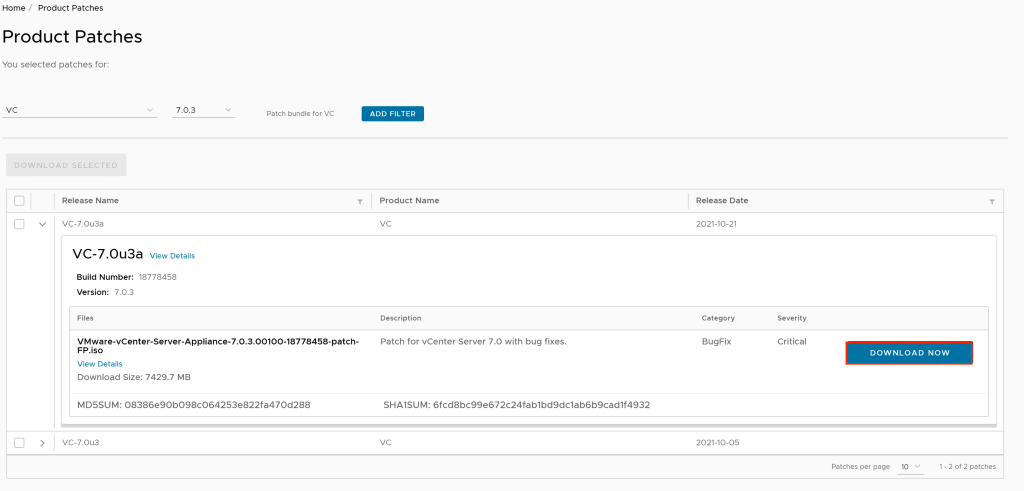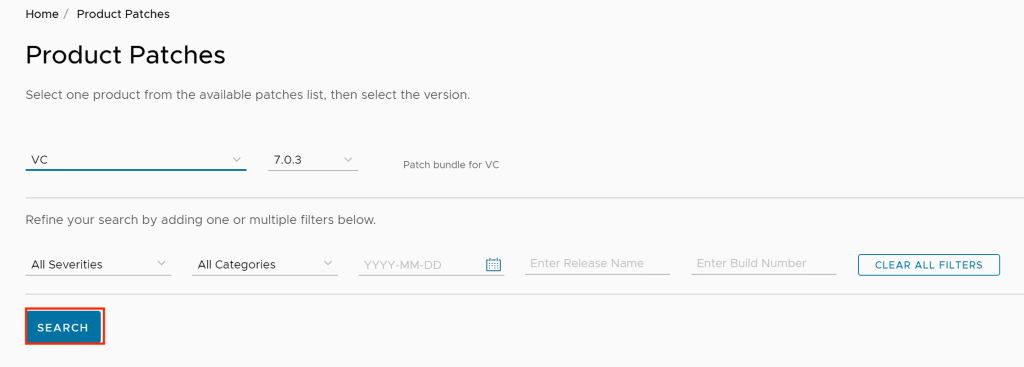- Using the pull-down selectors select VC as the product and the version you wish to patch to (7.0.3 in this case) and then click on Search.