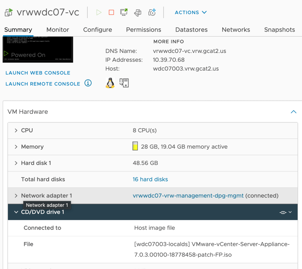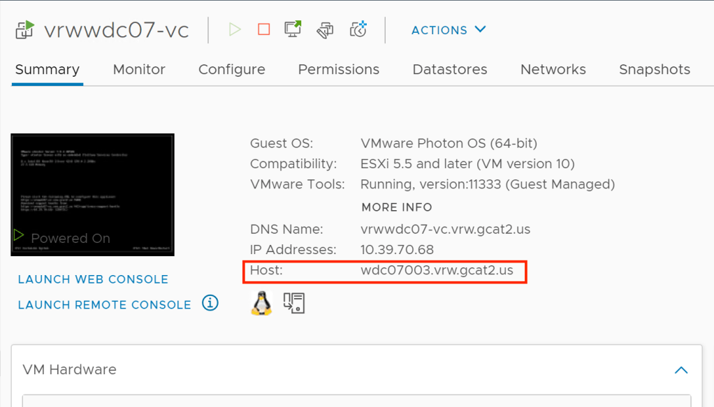 - Determine the host vCenter Server currently is on. This is easily located on the summary tab of the virtual machine. In the example below vCenter Server is running on host wdc07003.vrw.gcat2.us.