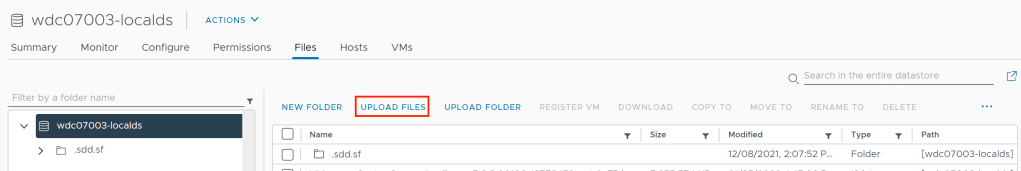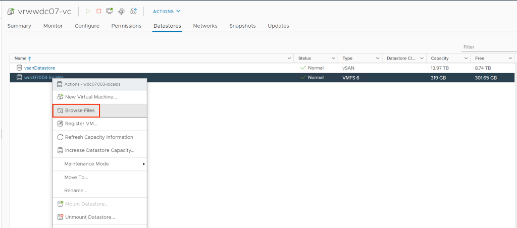 - Then if you click on Datastores in the top navigation you can see which datastores are accessible. In the example we will use wdc07003-localds and so will right-click on that datastore and choose Browse Files.