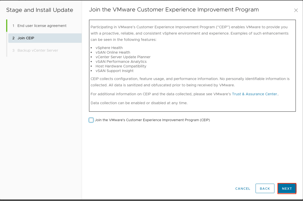 - Choose whether or not to join the VMware Customer Experience Improvement Program and click on Next.