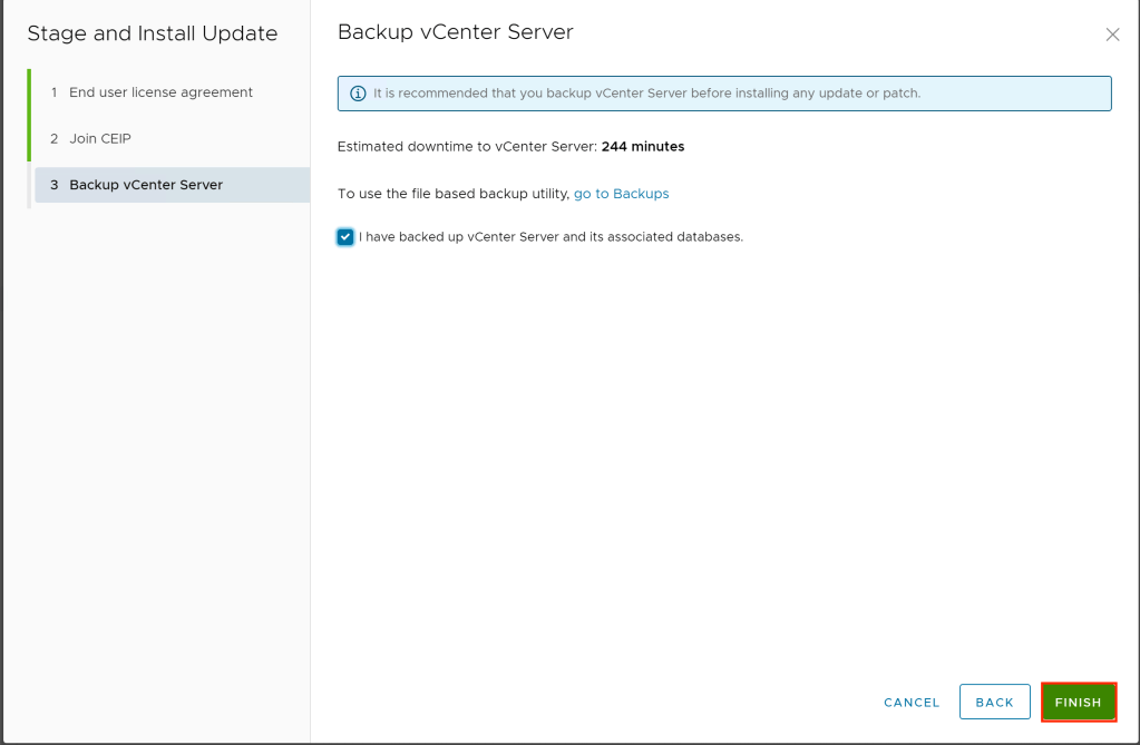 - Verify you have backed up vCenter and click on Finish to begin the update.