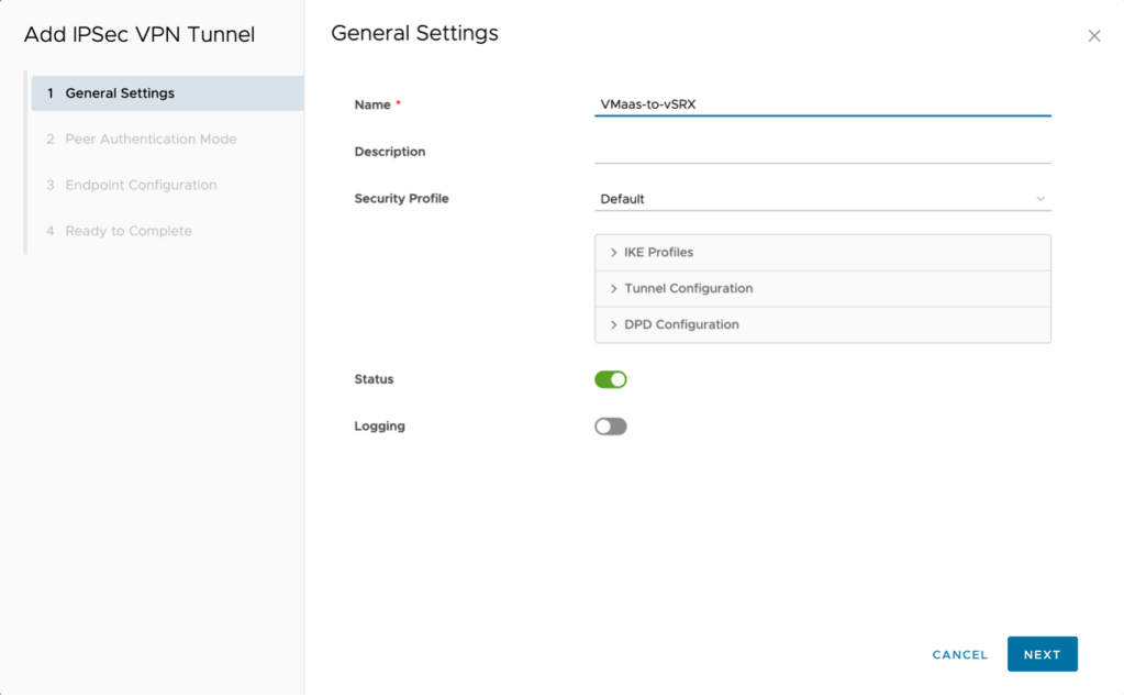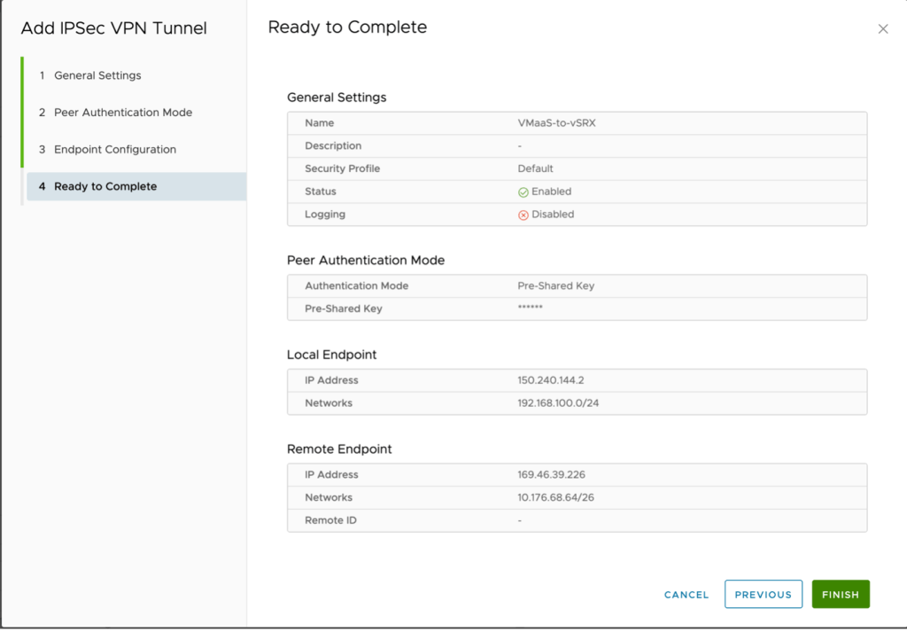 - Define the Phase 2 parameters that the Juniper vSRX VPN requires to create a VPN tunnel with VMware as a Service – single tenant.