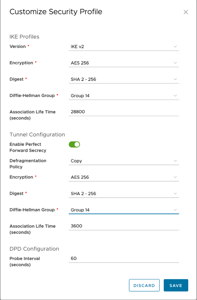 Adjust the following values for both the IKE profiles and the tunnel configuration.: