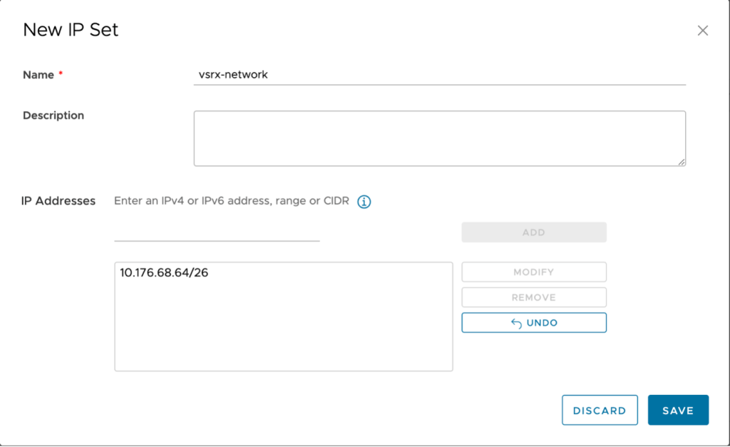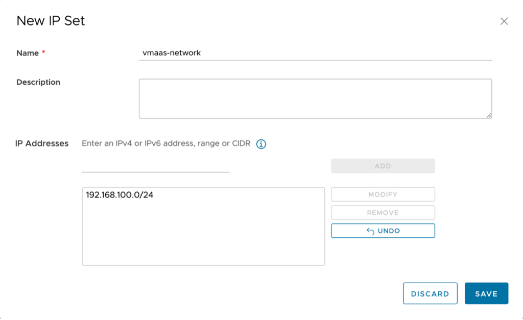 - Create a second IP set for your network behind the Edge Gateway in VMware as a Service – single tenant. In the example vmass-network is used as the name and 192.168.100.0/24 (same as the network created in step one) is used. Click add to add the IP set then click Save to complete the window. The new IP set will be added.