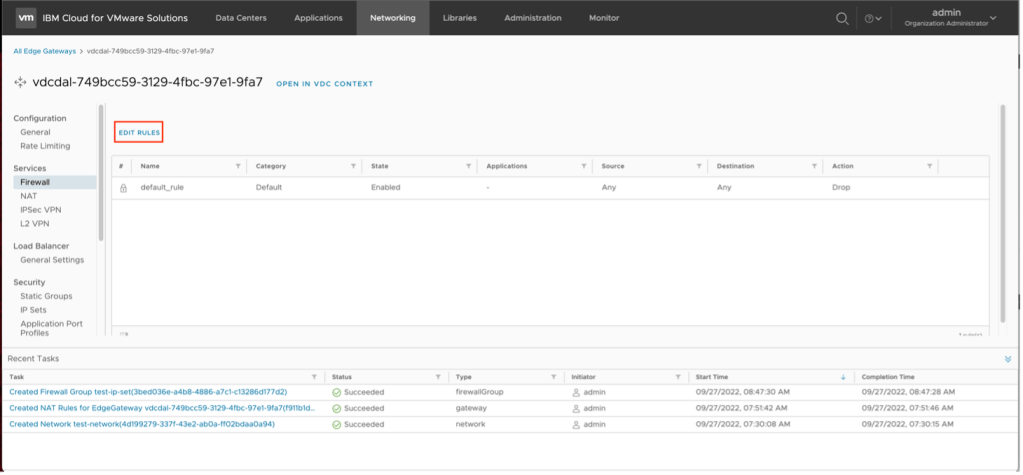 The next step is to create a firewall rule. By default, the VMware as a Service – single tenant instance has been provisioned with a default firewall rule that will drop all traffic to ensure security. Two additional rules must be put in place to allow the traffic to and from the VPN connection.
