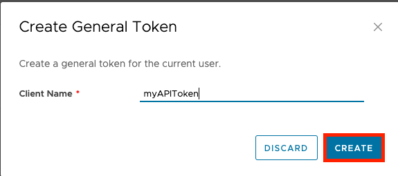 Give your new API token a friendly name and click CREATE. In the example below myAPIToken is used.