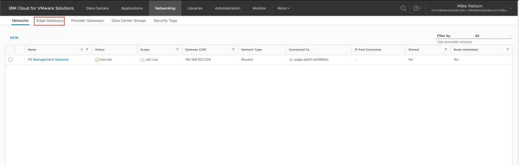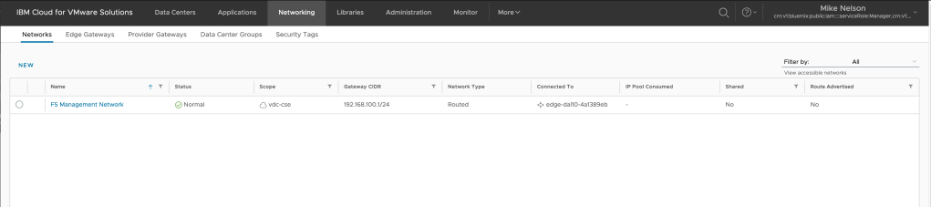 This tutorial series will go through integrating the F5 BIG-IP load balancer into your VMware Cloud Director environment as a tenant. For this first part, I will cover the initial network deployment prior to installing the F5 appliance. Specifically, I will be using IBM Cloud VMware Solutions Shared, which is backed by NSX-V. A future blog post will cover integrating with a Cloud Director environment backed by NSX-T (now just NSX).