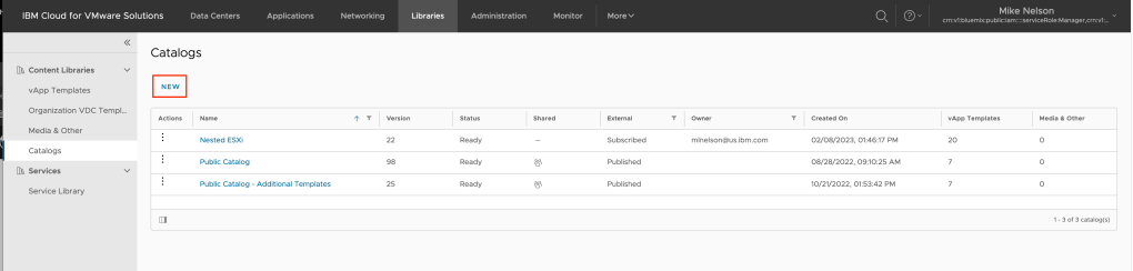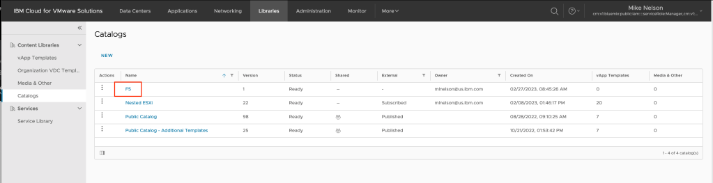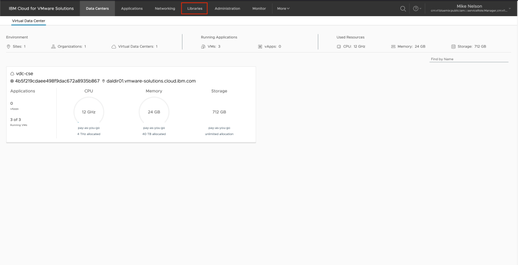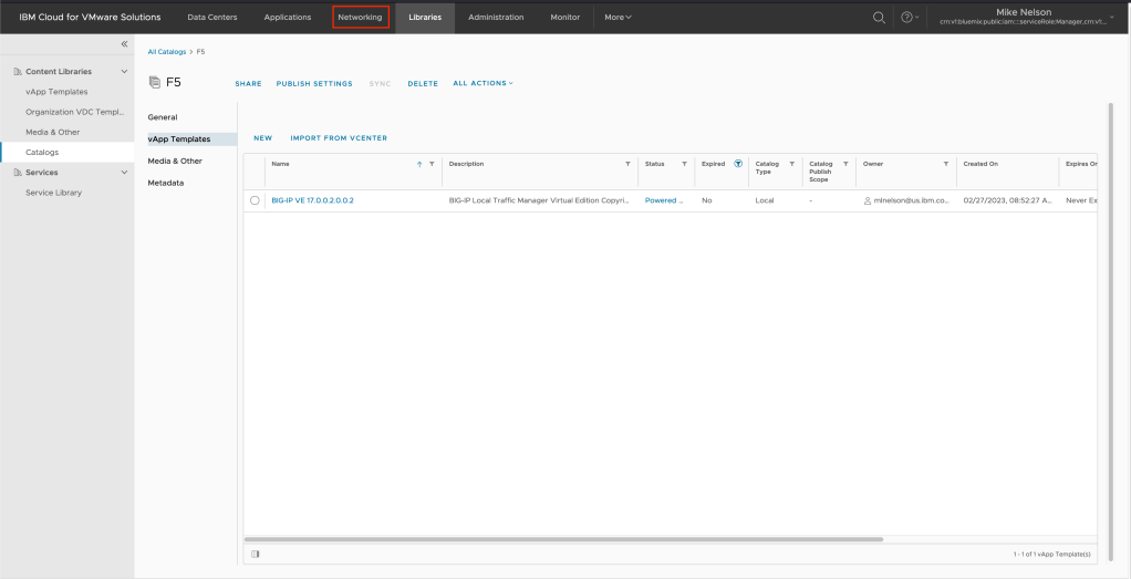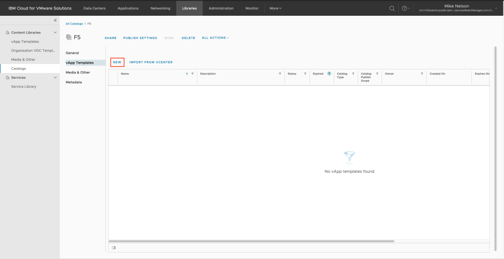 The first thing we want to do is create a catalog and upload our F5 OVA to that catalog. To do so, in the upper navigate click on Libraries.