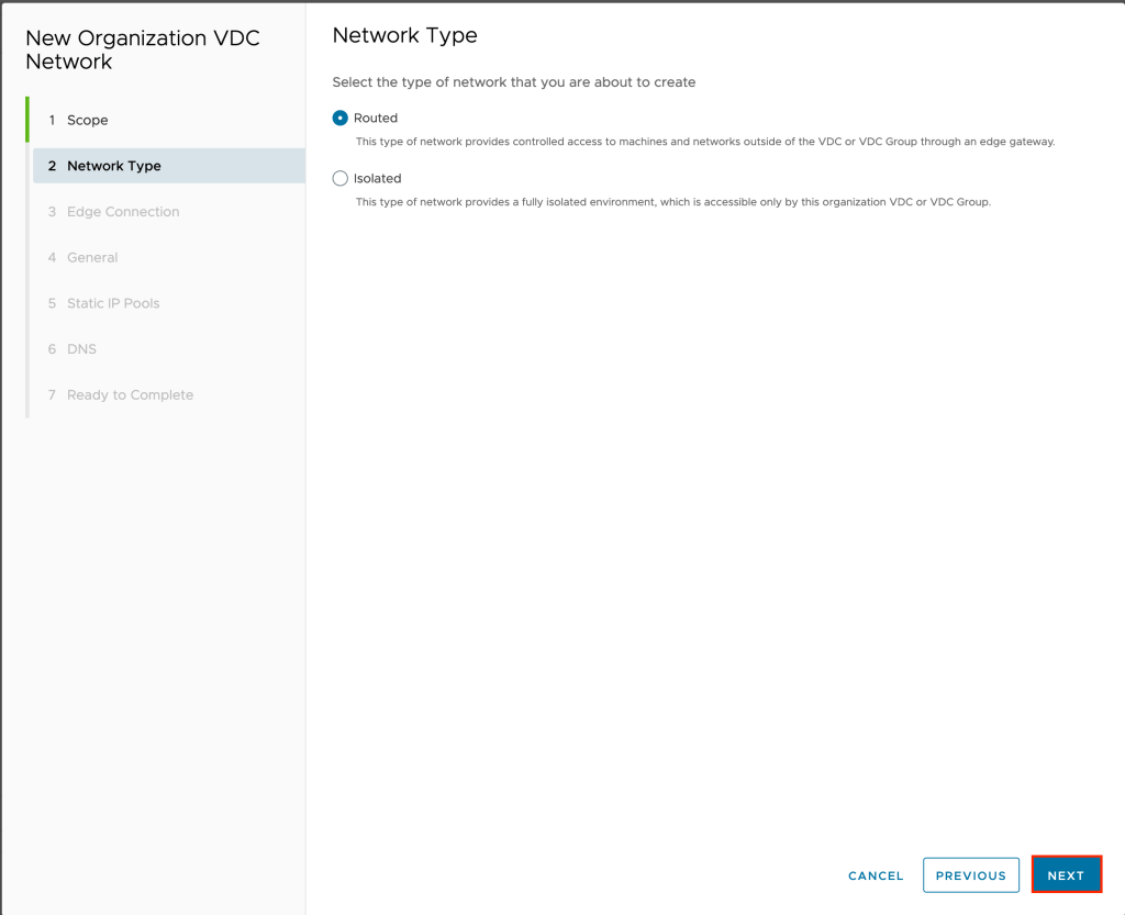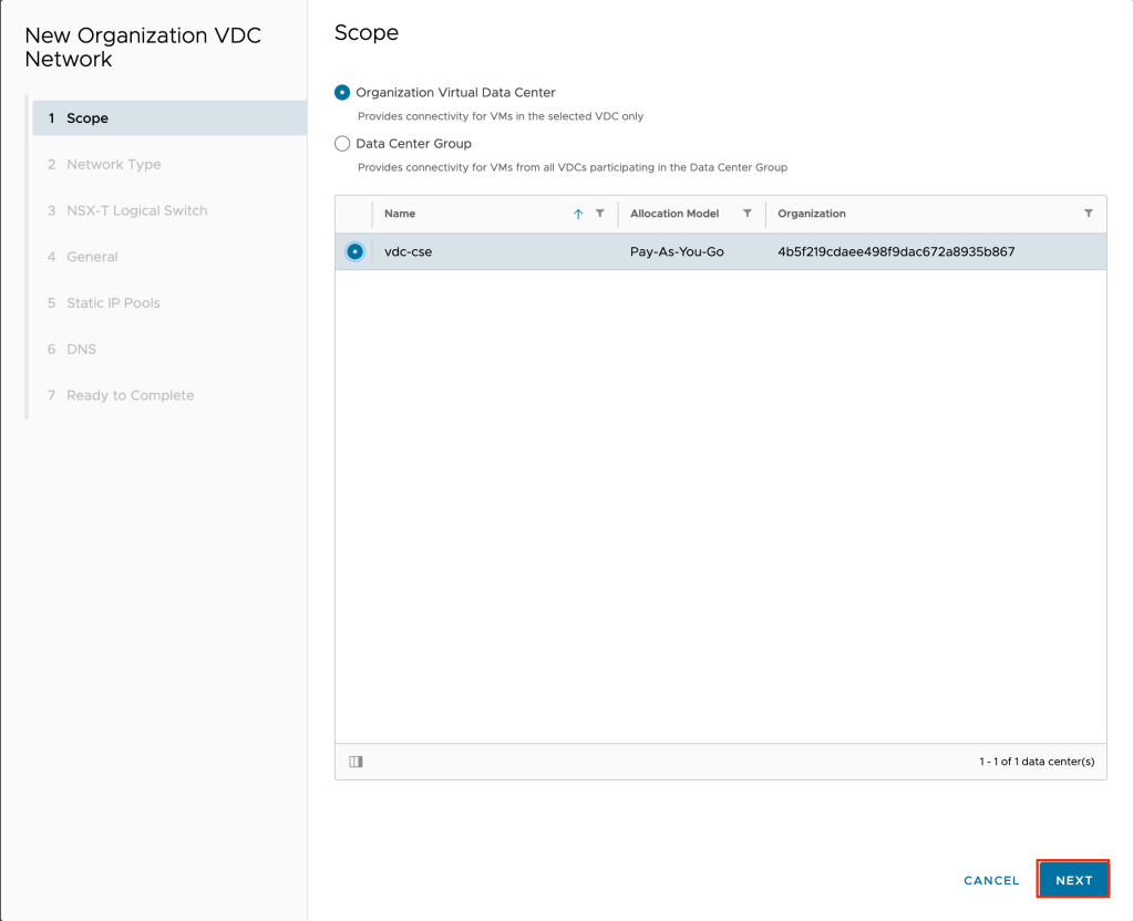 On the scope page of the wizard, click on the virtual data center you wish to create the network in and click NEXT.