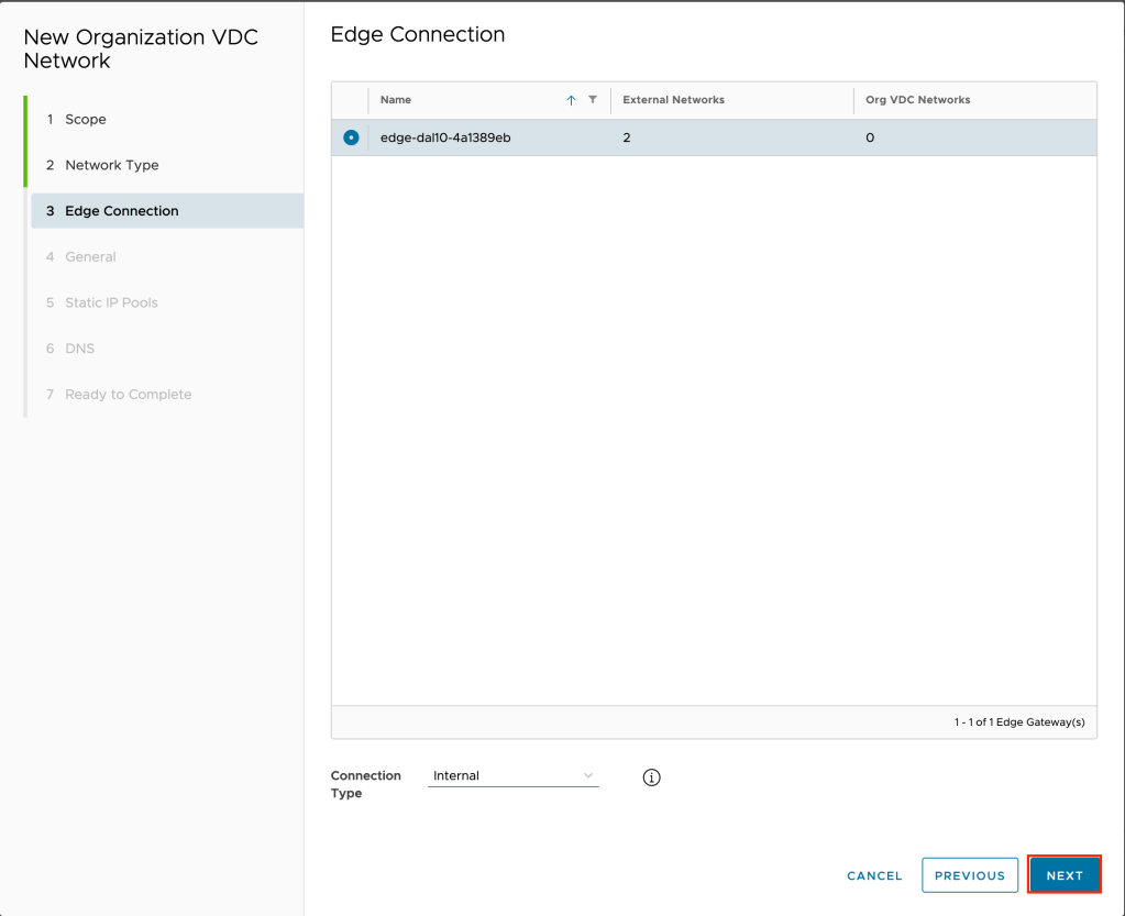 Select the edge you wish to create the network on and leave the connection type as internal and click NEXT.