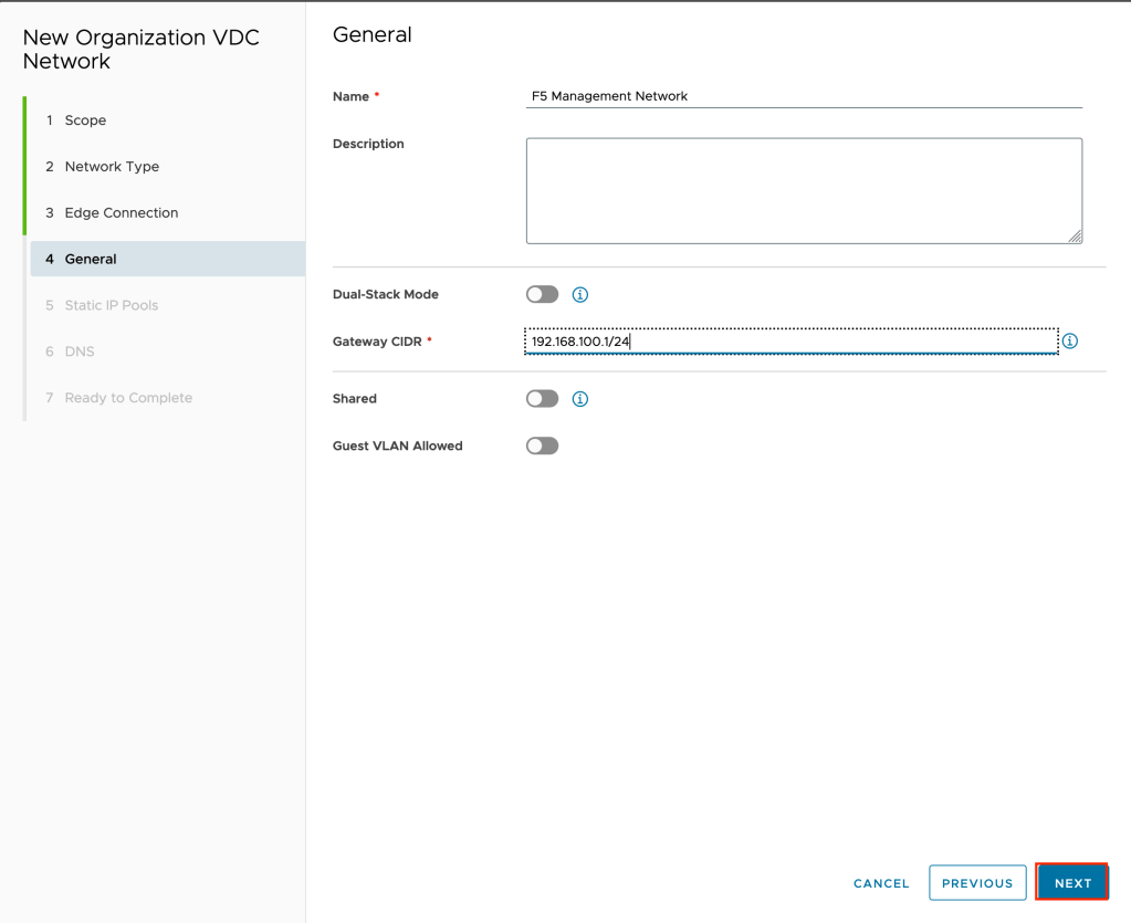 On the static IP pools page, type in the pool to use and click on NEXT to continue. While we will be manually assigning the IP address of the F5 management interface we still need to assign a pool. In the example 192.168.100.100-192.168.100.200 is used.