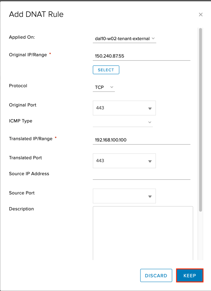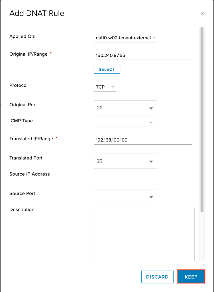 Leave all other values at their default and click KEEP to create the new DNAT rule.