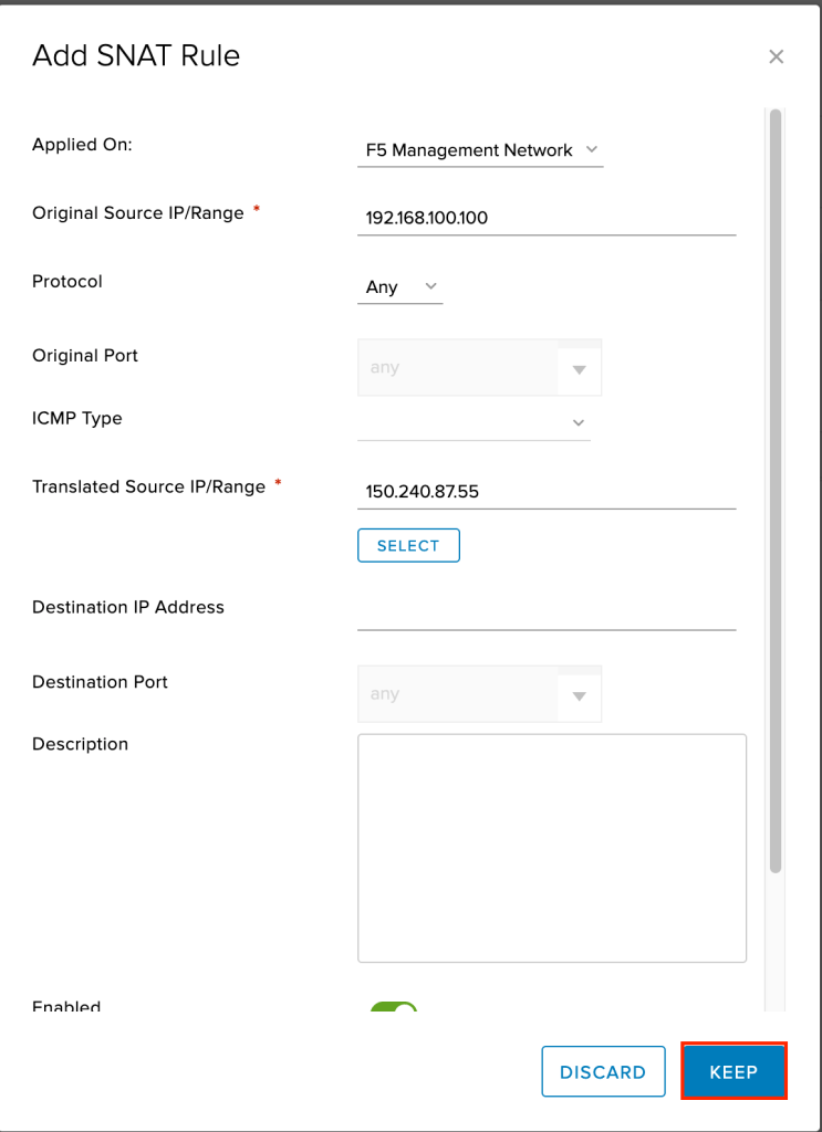 Leave all other values at their default and click KEEP to create the new SNAT rule.