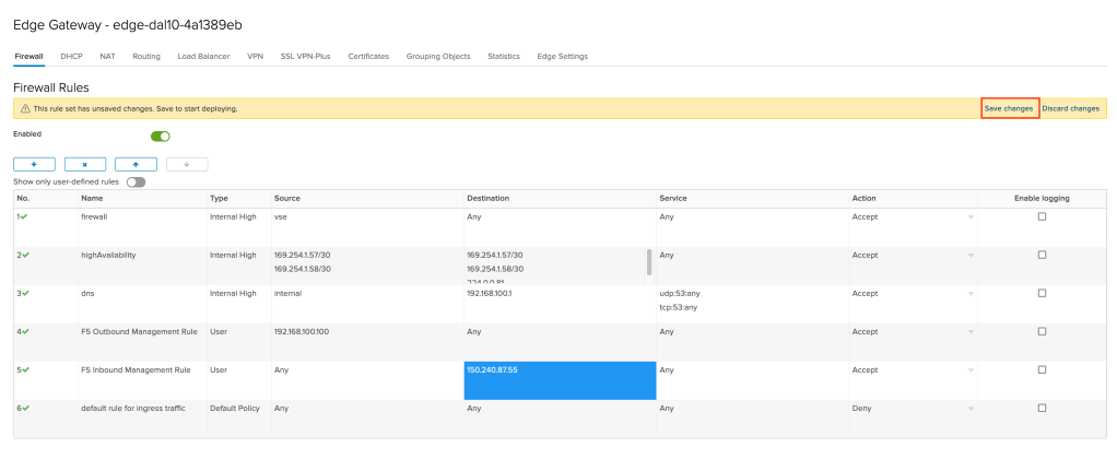 Leave all other values at default. Click on Save changes to complete your firewall rules and deploy them to the environment.