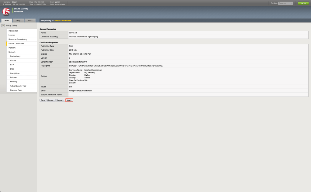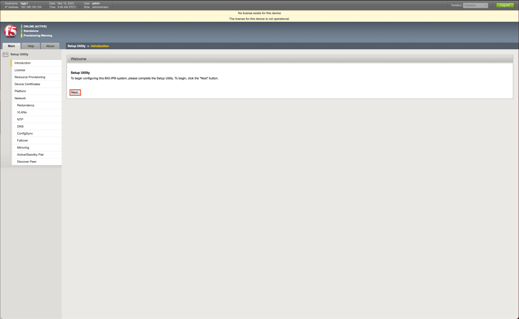 You will automatically enter the Setup Utility for the F5 appliance. Click Next to continue.