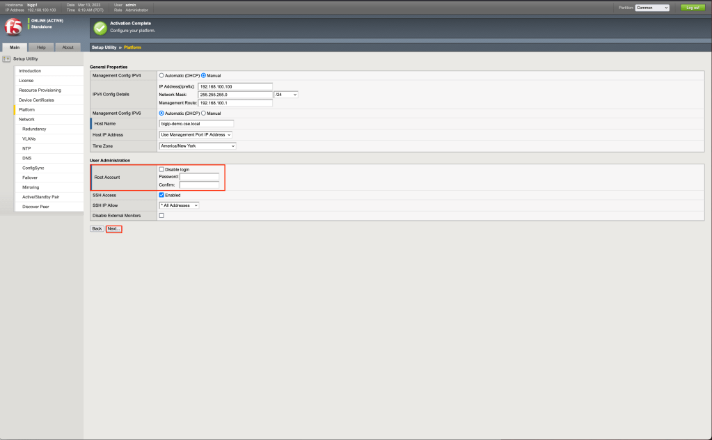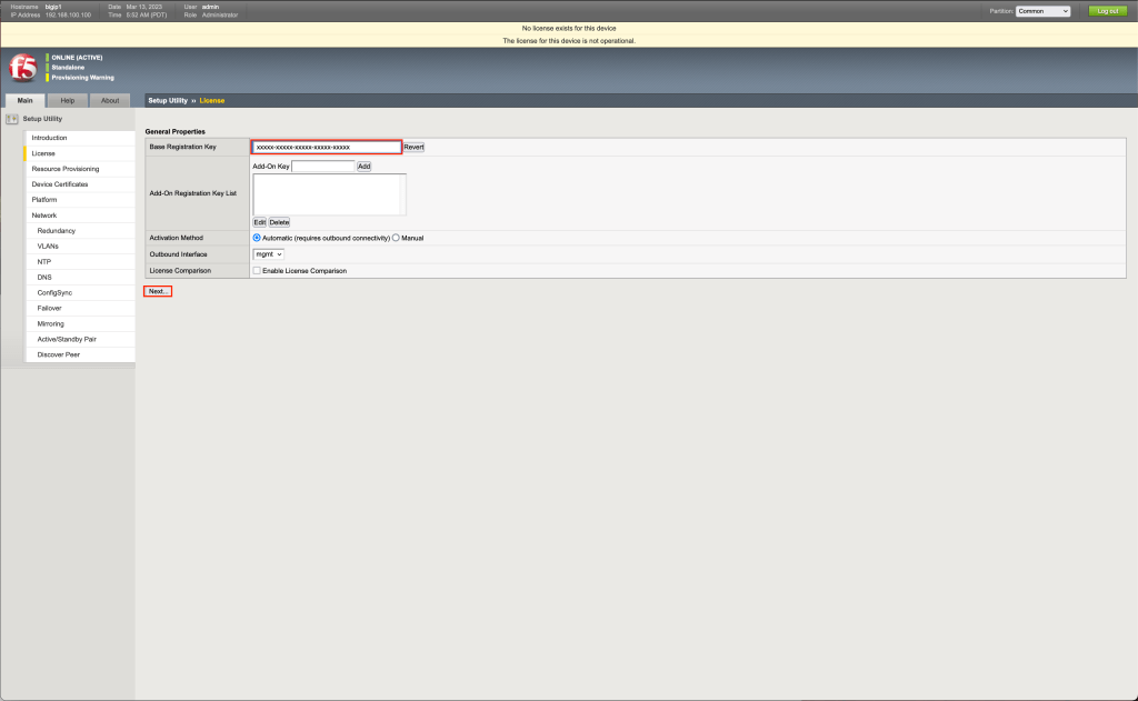 Input your license key (either trial or full) and click on Next to continue. As we setup NAT rules in previous steps to allow Internet connectivity the F5 appliance can go out to the Internet to activate. It may take several seconds after you click Next to respond.