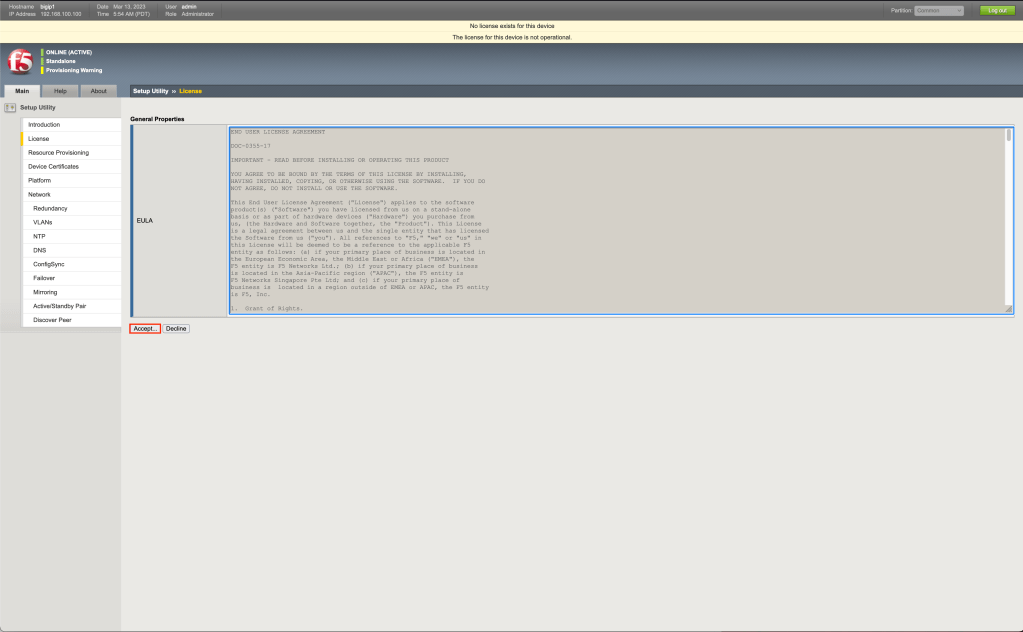 If you have been following along, at the end of the previous part we had installed the F5 and were at the login prompt of the web UI. This is where we will begin this part.