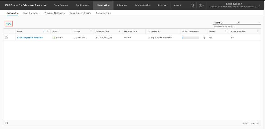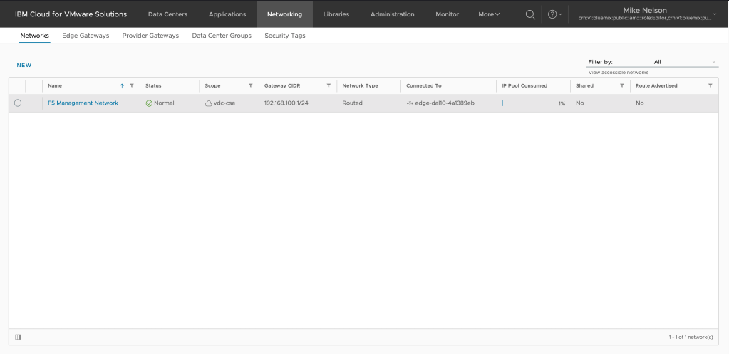 To start this part, log into your Cloud Director virtual data center and navigate to the networking tab. So far – we have only created a single network which was used for F5 management.