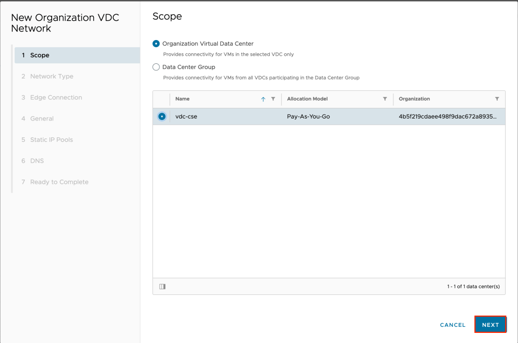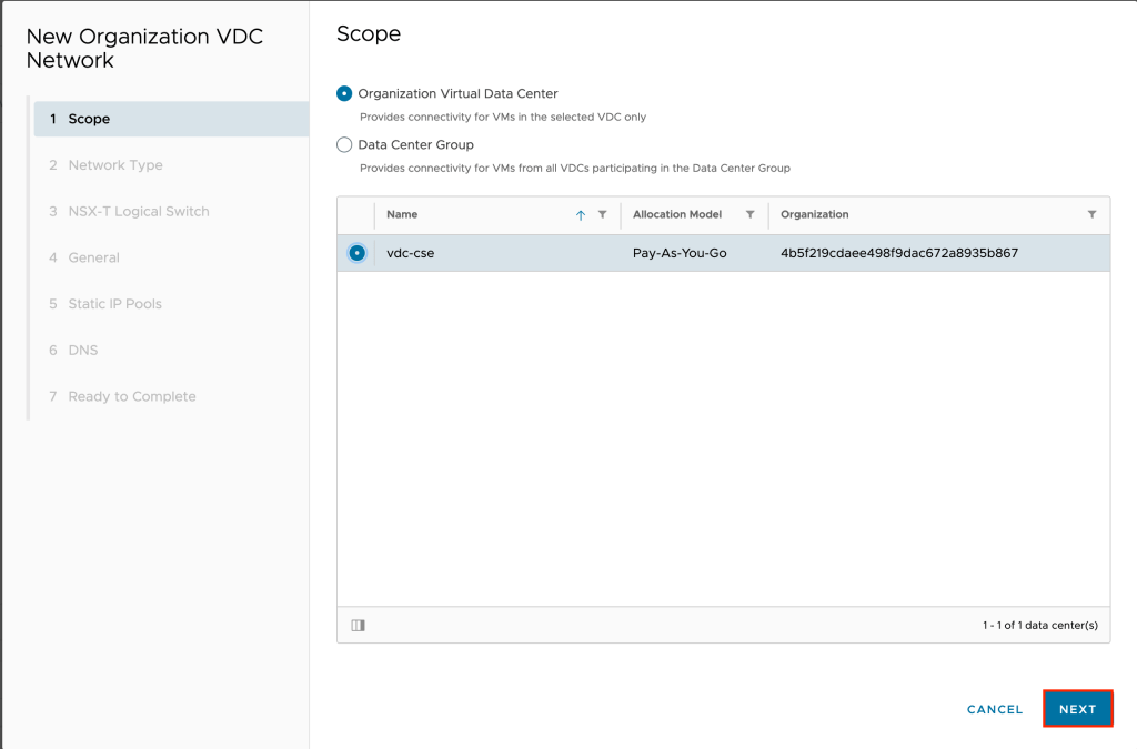Leave the scope at default (Organization Virtual Data Center) and select your VDC and click NEXT.