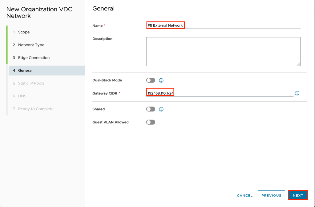 Give the network a name and a CIDR block. In the example F5 External Network is used for the name and 192.168.110.1/24 for the CIDR. Click NEXT to continue.