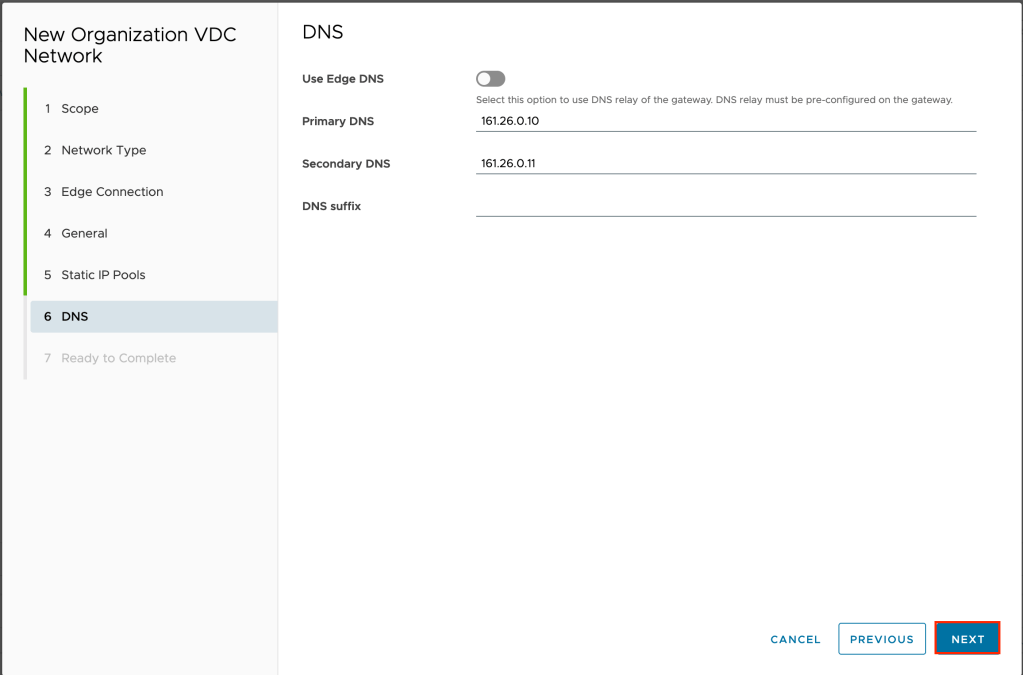 Optionally configure DNS. In the example I am not using the default DNS but using the external DNS servers of IBM Cloud. Click NEXT to continue.