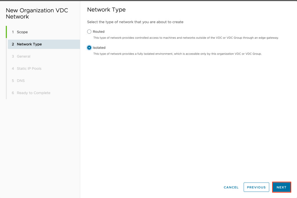 For the network type, this time we are going to choose Isolated as opposed to Routed. The reason for this is that for the internal traffic behind the F5 we do not want it to use the edge gateway inside VMware vCloud Director to provide network access. Instead, the F5 will be providing this access, therefore we set this network to Isolated. Click NEXT to continue.
