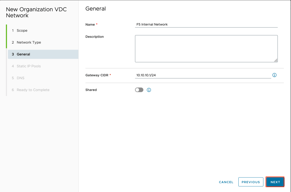 Give the network a name and a CIDR block. In the example F5 Internal Network is used for the name and 10.10.10.1/24 for the CIDR. Click NEXT to continue.