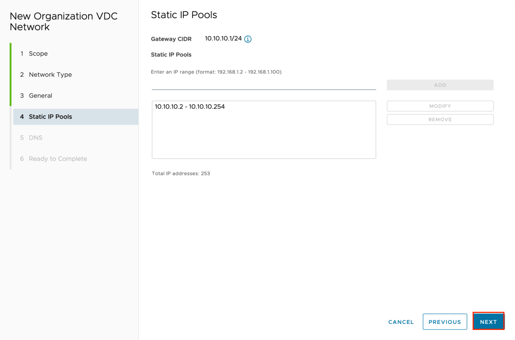 Once again, create a static IP pool. In this example the entire range of the CIDR block is used, so 10.10.10.2-10.10.10.254. Click NEXT to continue.