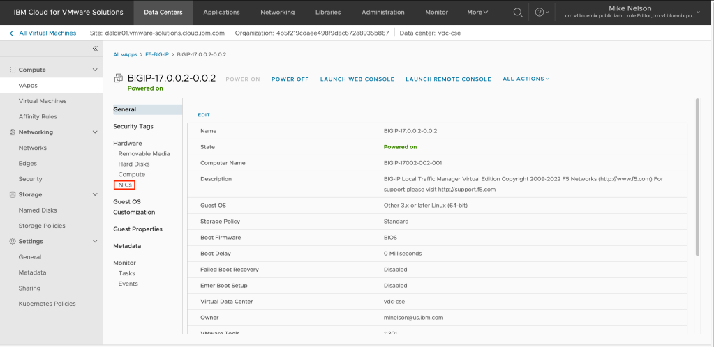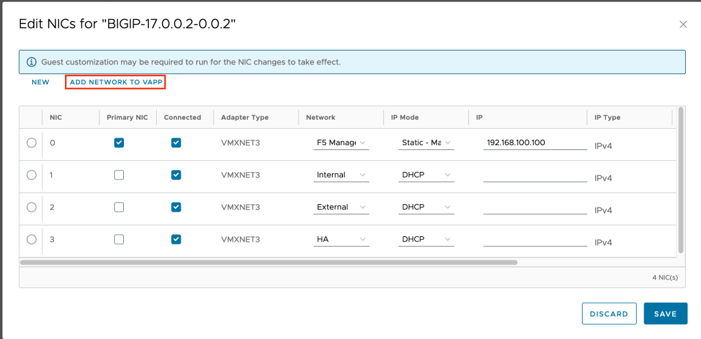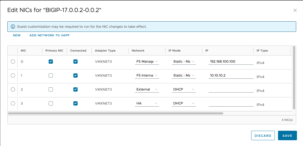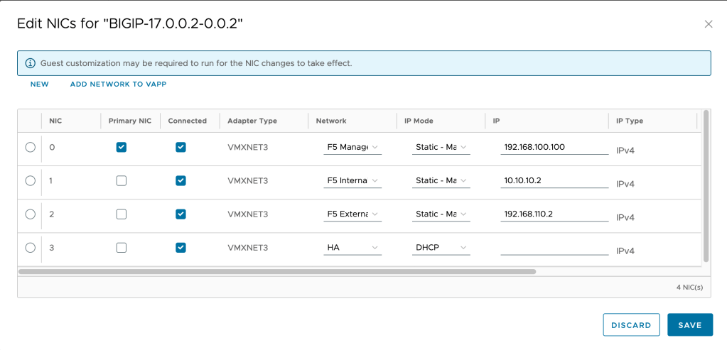 Now that we have added our networks, we can assign them to the appropriate NICs on the virtual machine and assign IP addresses to them. In this case we want to assign the F5 Internal Network to NIC 1 and the F5 External Network to NIC 2.