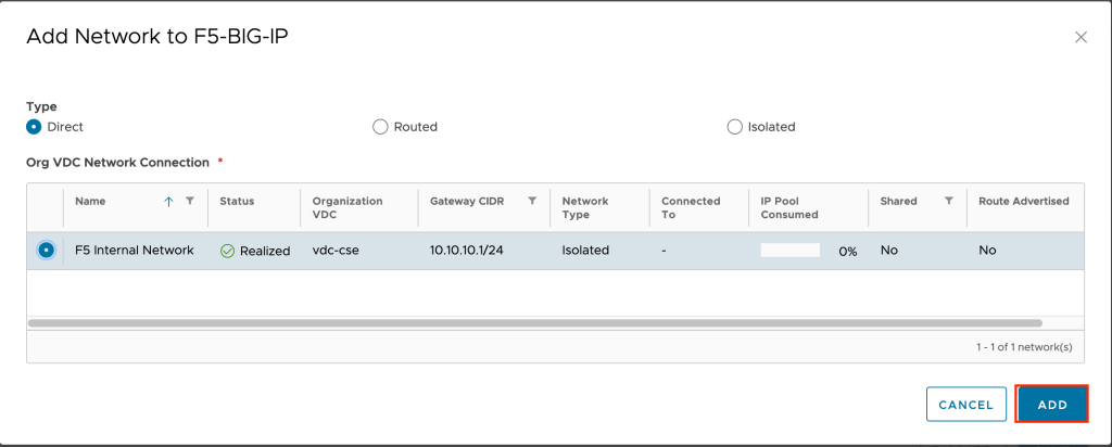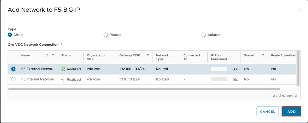 For type select Direct, then select the F5 External Network you created previously and click on ADD.