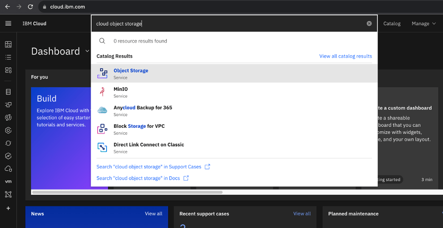 - Using the search box in the menu bar, type cloud object storage and select the object storage service.