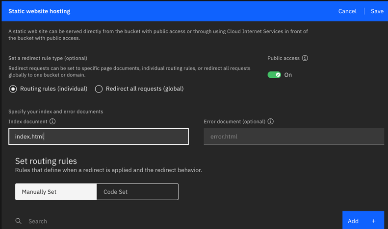 - Under Index document, type index.html. Note that this is a placeholder as no index.html will be uploaded.