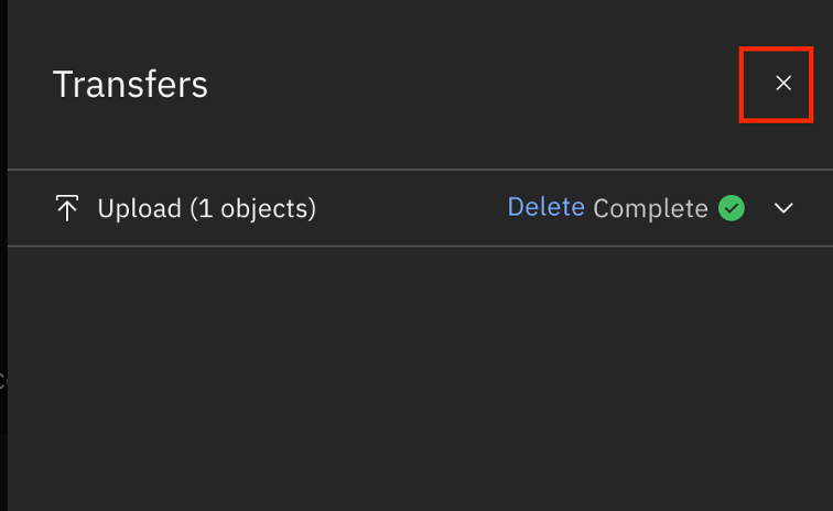Once the upload is complete close the transfer tab by click on the X in the upper right corner of the fly-out panel and stay on this page to continue to the next step.