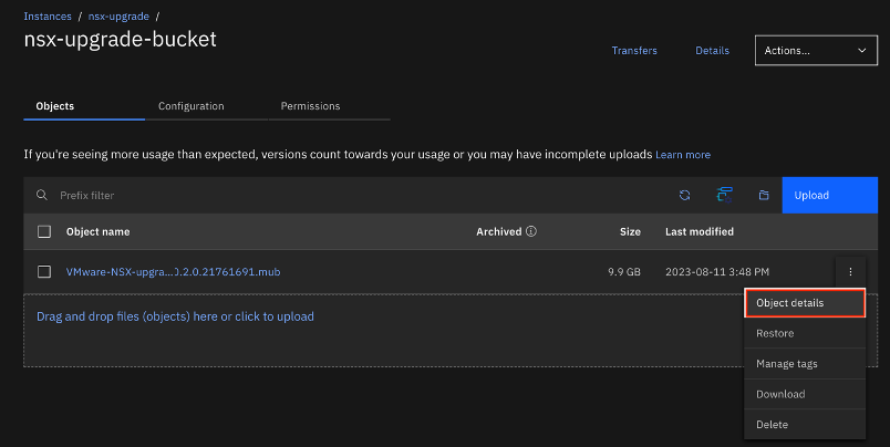 - On the object details fly-out, note and copy the Public URL for the file. In the example the URL is https://nsx-upgrade-bucket.s3.eu-de.cloud-object-storage.appdomain.cloud/VMware-NSX-upgrade-bundle-4.1.0.2.0.21761691.mub. Note that this is the Public URL. During the upgrade we will be changing this URL to reflect the private endpoint. However, if your NSX Manager does have public Internet access this URL can be used.