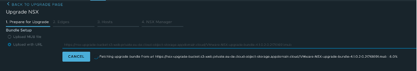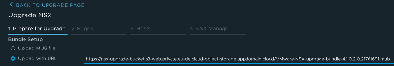 - Therefore from the example the correct URL is https://nsx-upgrade-bucket.s3-web.private.eu-de.cloud-object-storage.appdomain.cloud/VMware-NSX-upgrade-bundle-4.1.0.2.0.21761691.mub.
