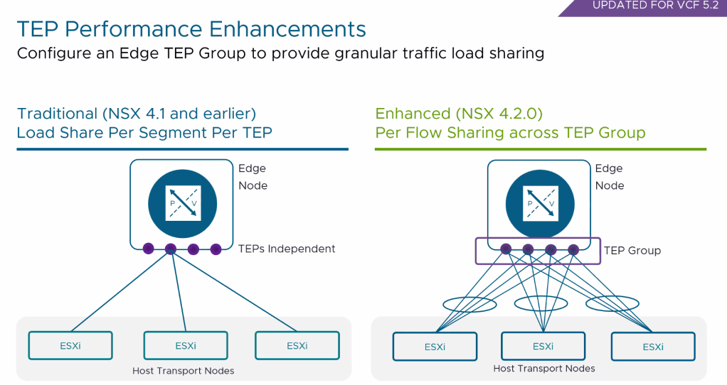 One of the bottlenecks you can experience in NSX is the communication between your ESXi hosts and your edge nodes. In NSX 4.1 and earlier, this was a single path based upon the segment, and since the typical design is that these share a segment that meant you could have all the traffic from a cluster of ESXi hosts going to a single TEP, making that the bottleneck in your software defined network. With NSX 4.2.0, VMware has added a new feature called TEP groups, meaning you can have multiple TEP’s servicing traffic from multiple hosts. Instead of per segment, now the granularity for load sharing is per flow, meaning better scalability and performance.