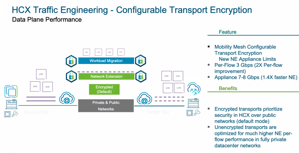 Security is good, and needed. But what if you are doing a migration from say an old vSphere 6.7 instance to vSphere 8 and want to use HCX to assist in the migration? And this is occurring inside your datacenter? Well with HCX 4.10 you’ll be able to decide if that flow needs to be encrypted or not, meaning you can turn it off when the flow is already encrypted by something else, or simply does not need encryption due to being a secure network. The benefits are huge – 2x per-flow improvement on network extensions an appliances can now handle 7-8 Gbps, which is a 1.4x improvement than before. It still defaults to secure, as it should, but being able to turn it off when it’s safe is a great improvement.